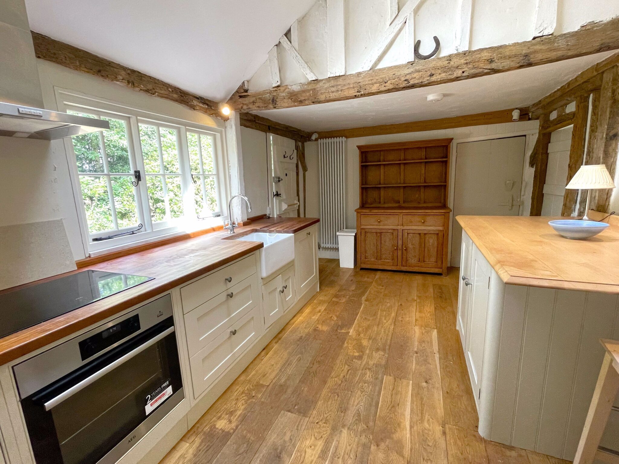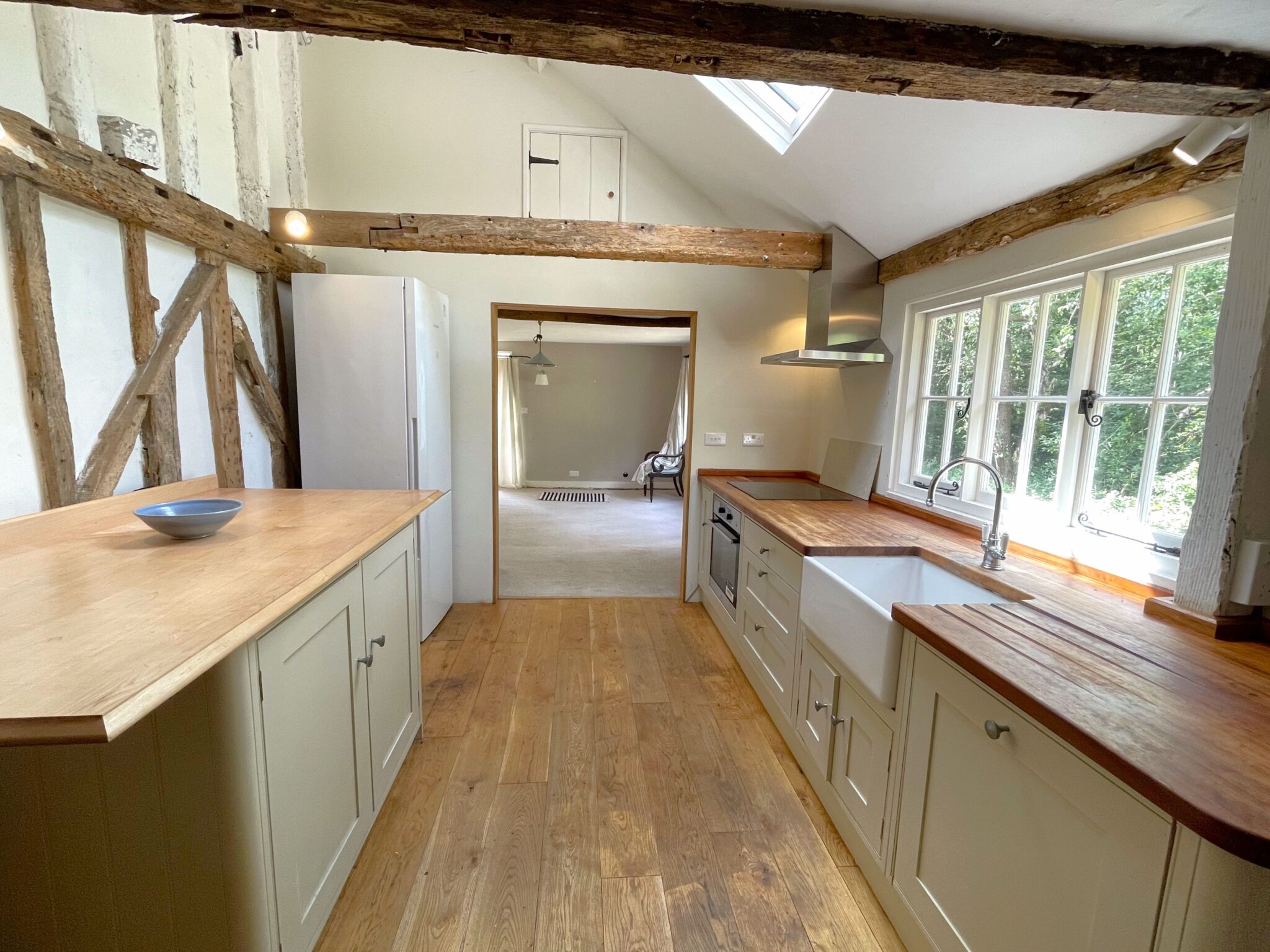 Kitchen 4.55 x 3.25 a sunny, vaulted, modern take on a farmhouse kitchen with integrated appliances.