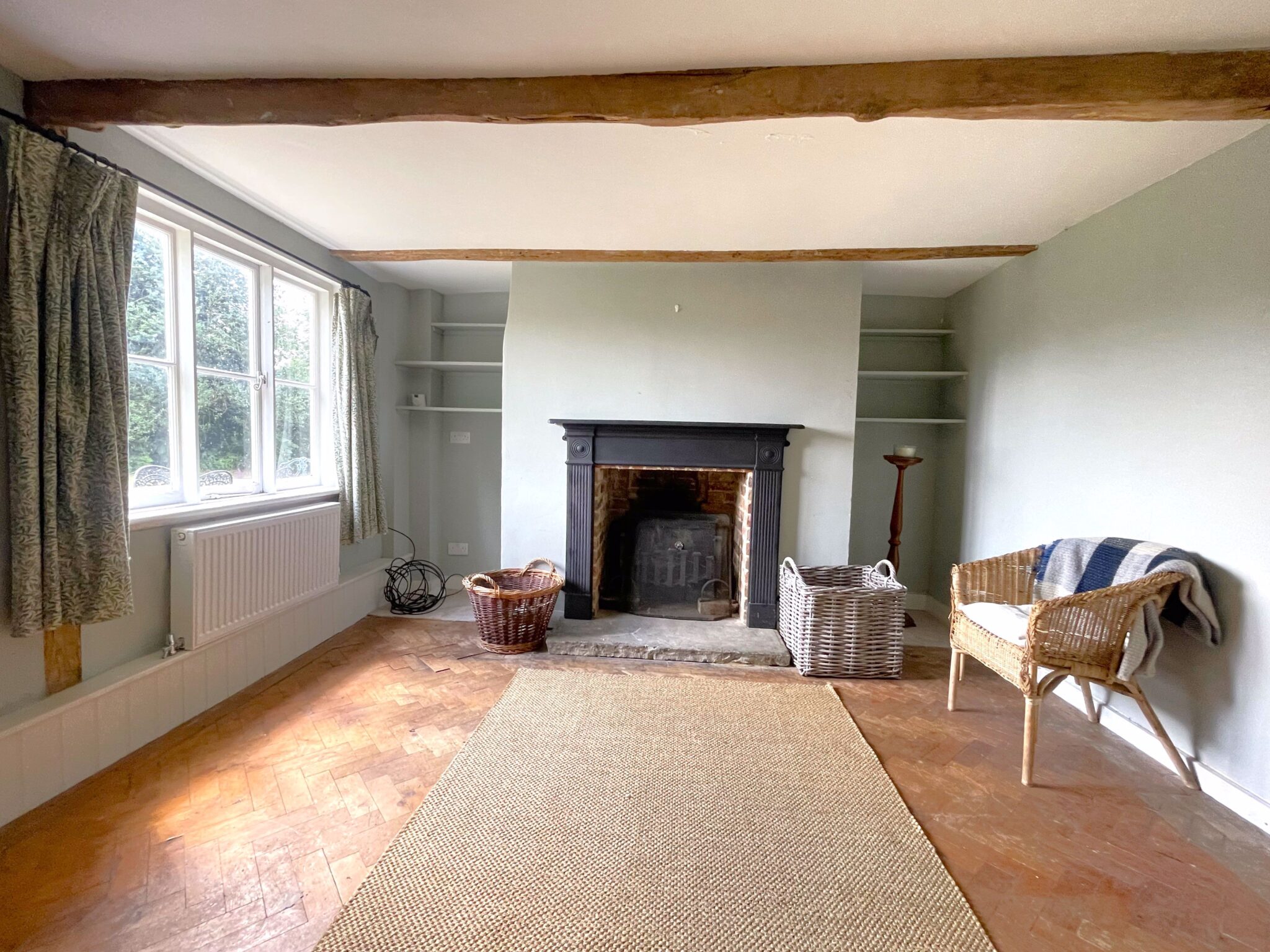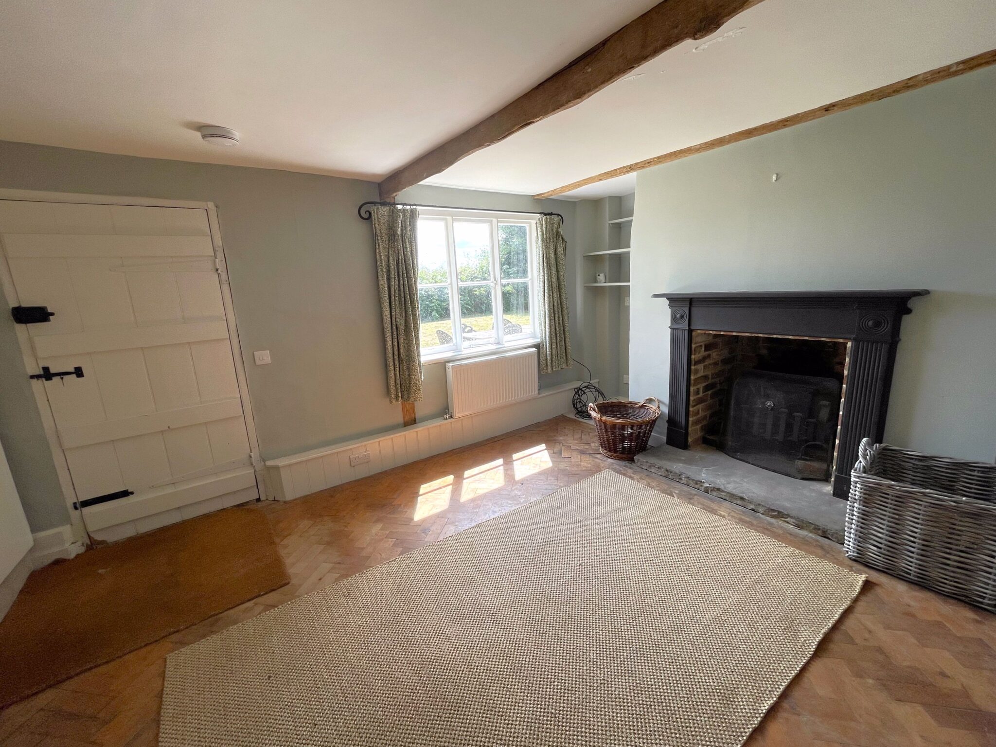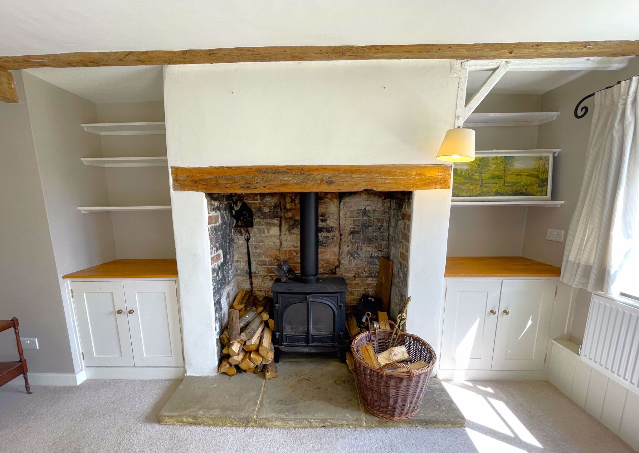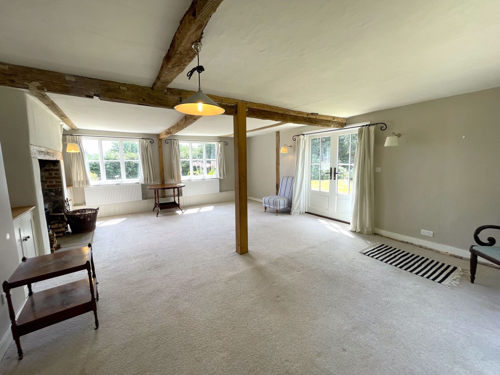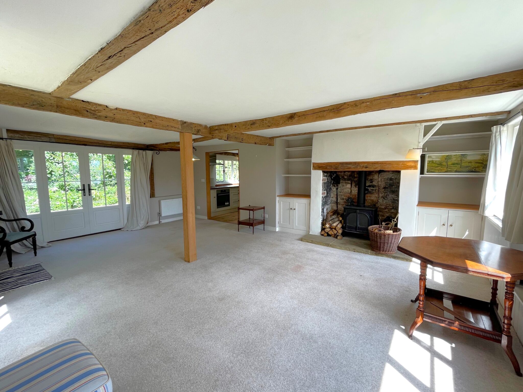 Sitting room 6.88 x 5.44m with woodburning stove and exposed timbers.