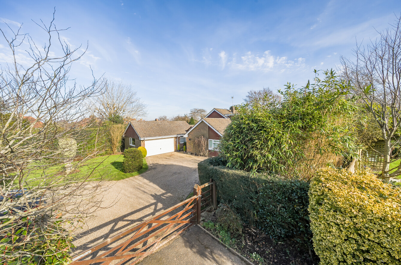 The Courtyard is an individual, detached chalet style family house, circa early 1970s presenting predominantly brick elevations with some tile hanging, set with UPVC double glazed windows, beneath a pitched tiled roof. The accommodation over time has been extended, altered and improved creating and well proportioned, flexible family home, now offering scope for updating of the interior fixtures and fittings if so desired. Features include a reception hall with a pitched glazed roof leading to an inner hall with doors leading off to a double aspect sitting room with brick fireplace and display shelving, housing a coal effect gas fire on a raised tiled hearth. Traditional parquet flooring extends to the hall, sitting room and dining room under existing carpet in some areas. A separate dining room has an aspect to rear across the garden. A fitted kitchen/breakfast room has some integral appliances including Belling double oven, grill and dishwasher, one and a half bowl sink unit with mixer tap over and a tiled floor. Double doors lead to the conservatory set on a dwarf brick wall with UPVC windows and panels, fitted with light and heating, double doors opening out onto the garden. The inner hall doors lead off to ground floor bedroom three and bedroom four, comprising a double and single room, fitted wardrobes, served by family bathroom one, fitted with a white suite including a bath with integrated shower. Bed/sitting room five accessed from the reception hall includes a kitchenette area and has an en suite shower room.