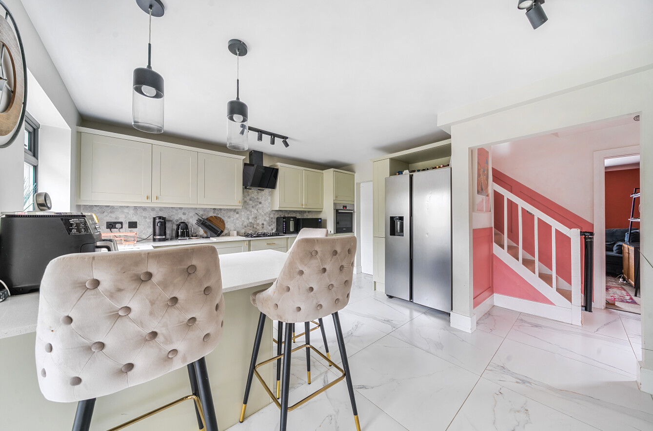 36 North Down is an extended, semi detached family house, presenting brick elevations, beneath a pitched tiled roof with dormers. The 1,123 sq ft accommodation is arranged over three floors.