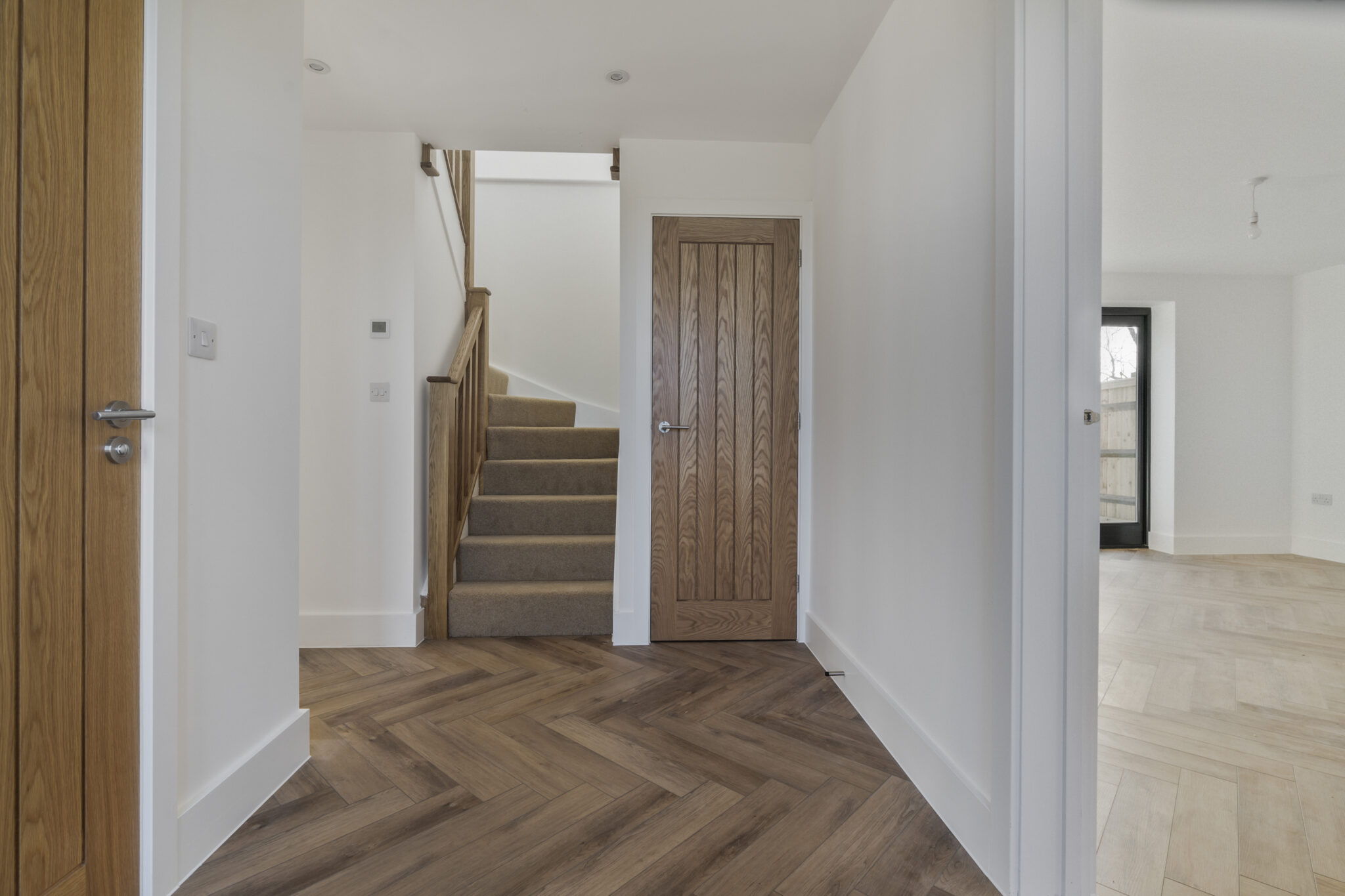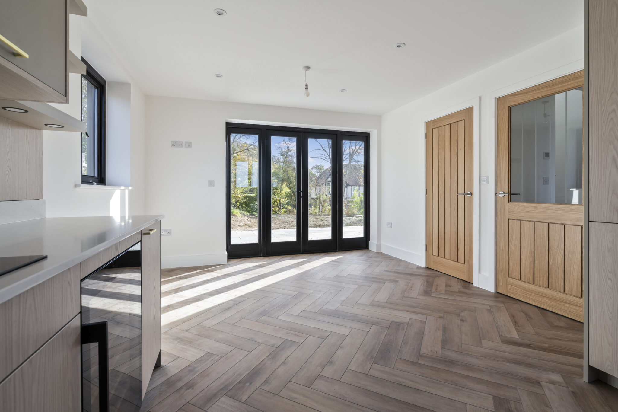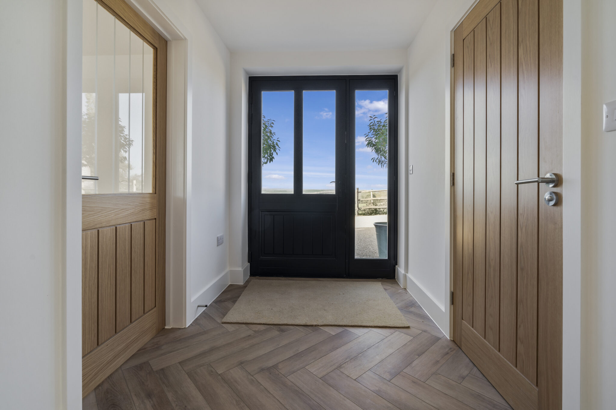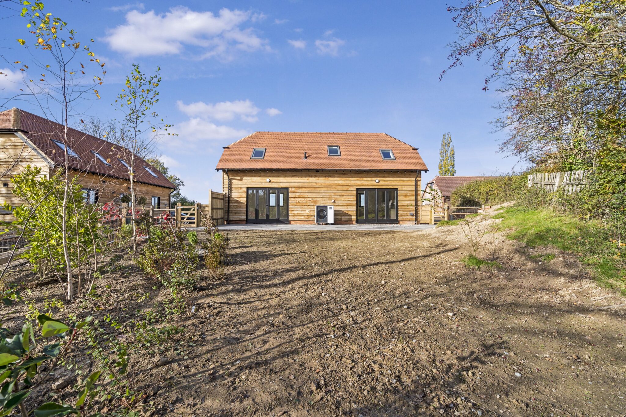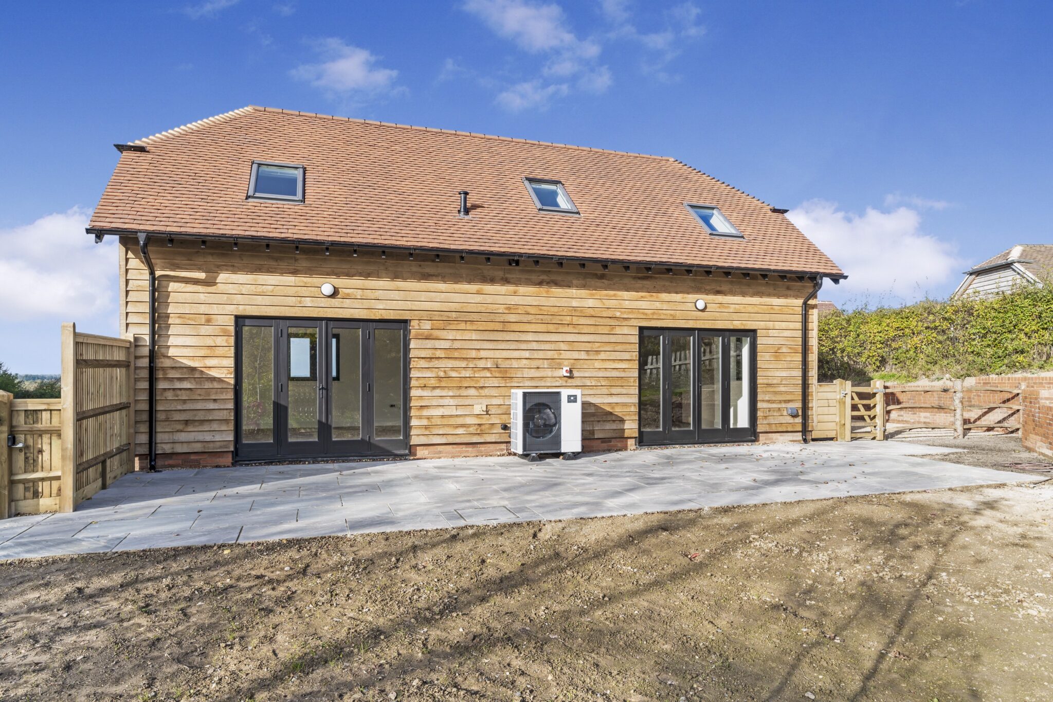 1 The View is a newly built detached barn style house by local development firm Baxtian Homes presenting oak weatherboarded elevations, set with timber framed, double glazed casement windows, roof line windows, beneath a pitched and half hipped tile roof.