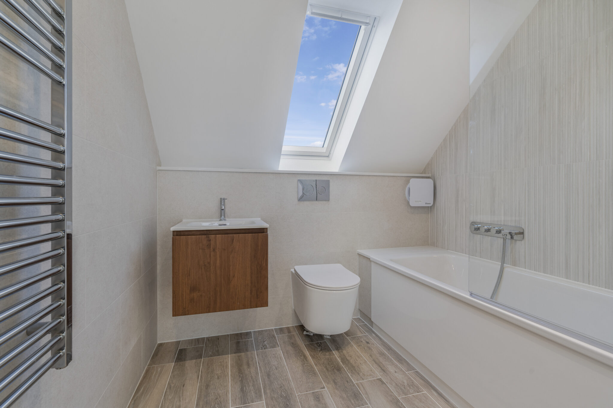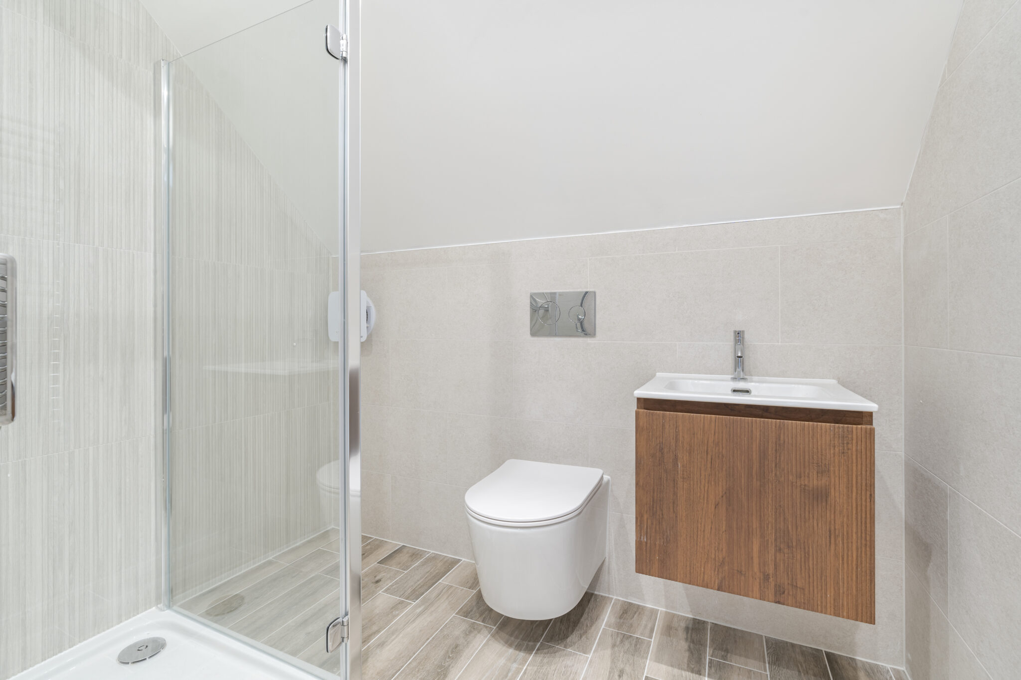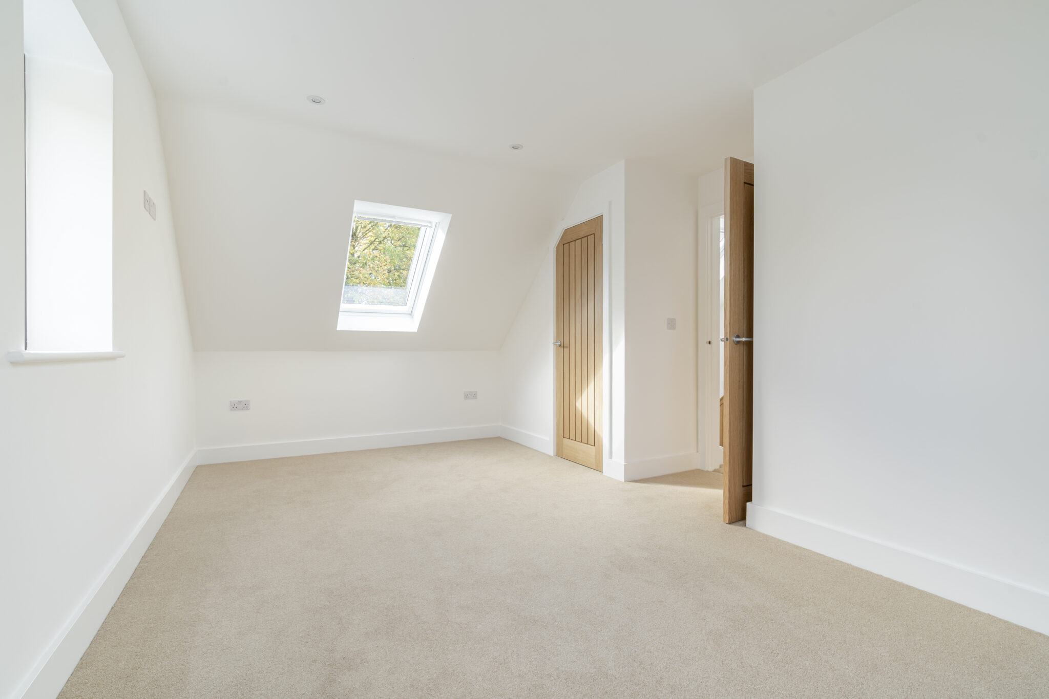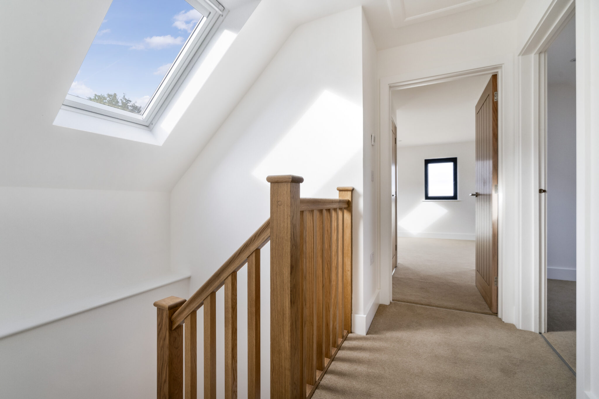 Arranged over the first floor galleried landing with automatic electric opening roof line window, doors leading off to the main bedroom, a triple aspect room enjoying far-reaching views out to rear across the neighbouring countryside and Bedgebury Forest. An en suite shower room fitted with a white suite. Bedroom two also a triple aspect room with walk-in wardrobe. A family bathroom is fitted with a white suite including a bath with integrated shower over, ceiling height and floor tiling.