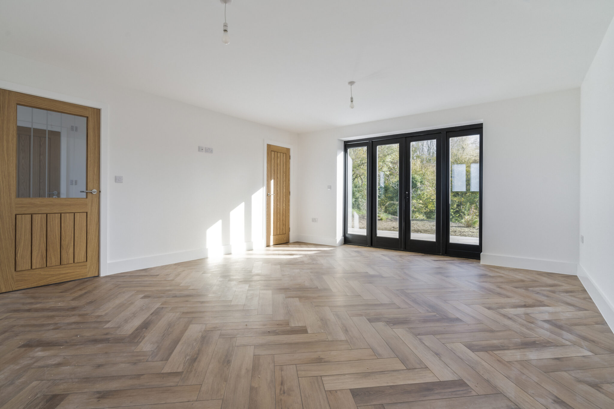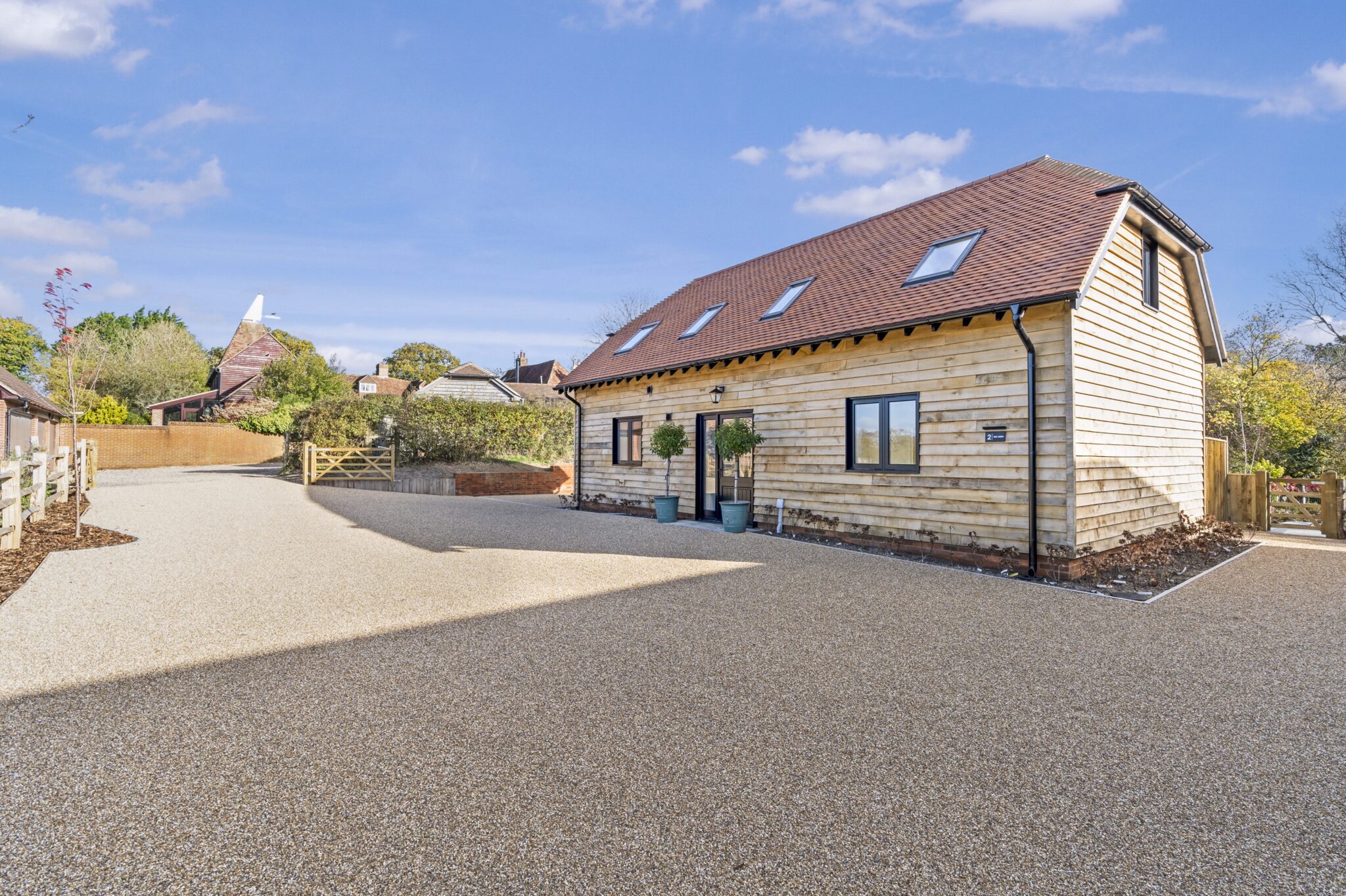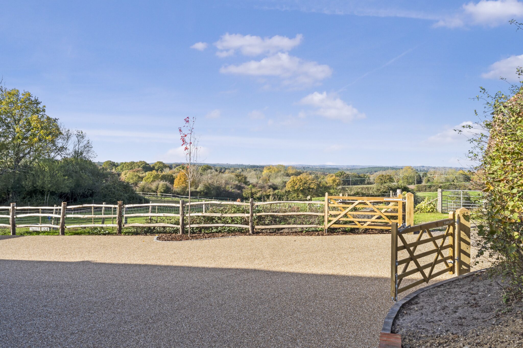 Outside, an initially shared driveway leads to pressed gravel drive and parking for two/three vehicles with EV charging point. The garden runs out to two sides which will be turfed upon completion, with paved patio, courtesy lighting, bordered by traditional post and rail fencing with dog proof wire netting. Fine views are enjoyed to rear across fields, countryside and Bedgebury Forest.