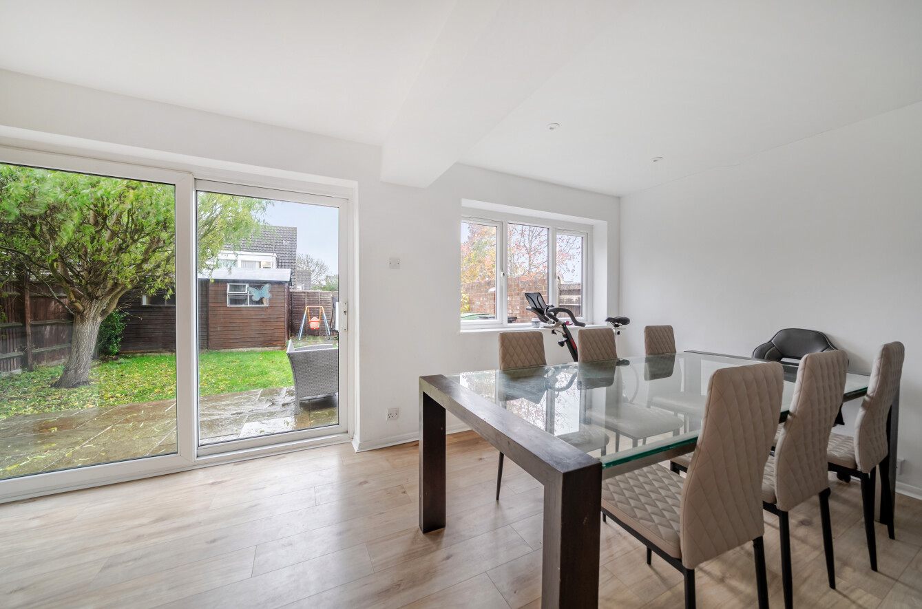 Outside, to the front and side is a lawned garden, two parking spaces and a single garage en bloc with a personal door immediately opening onto the garden. The rear garden is also laid to lawn, including a paved patio, willow tree, a timber garden shed, fitted with power. The whole is fenced and enclosed.