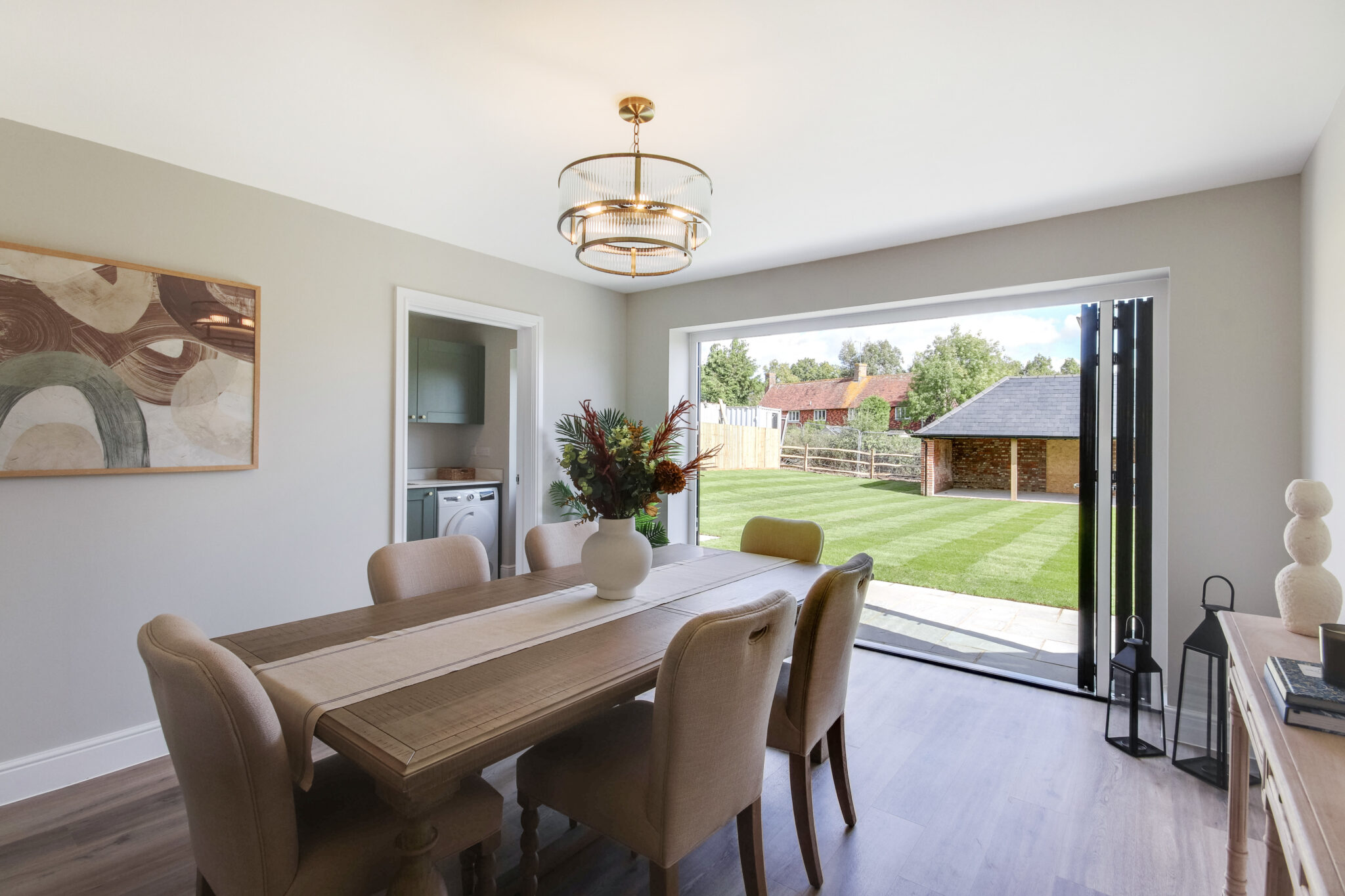 At the heart of the property, a stunning dual-aspect kitchen/diner enjoys light from both the front and rear, with bi-folding doors opening out to the garden – an impressive space designed for modern family life and effortless entertaining. A separate lounge offers a refined yet comfortable retreat with direct access to the turfed rear garden, while a dedicated ground floor home office provides the perfect work-from-home solution. A utility room and downstairs cloakroom add further practicality.