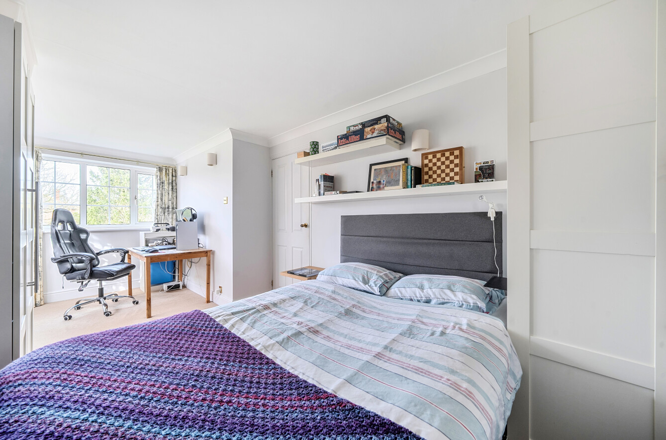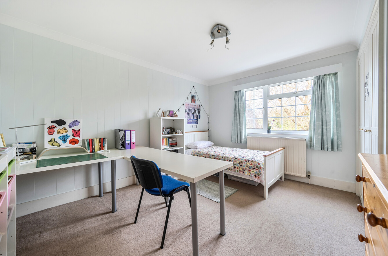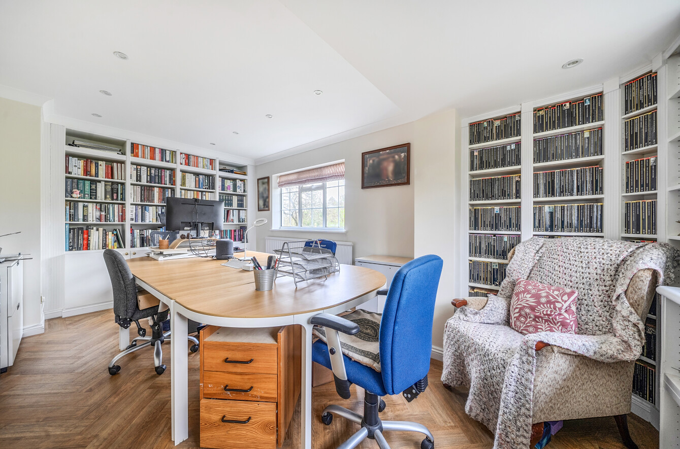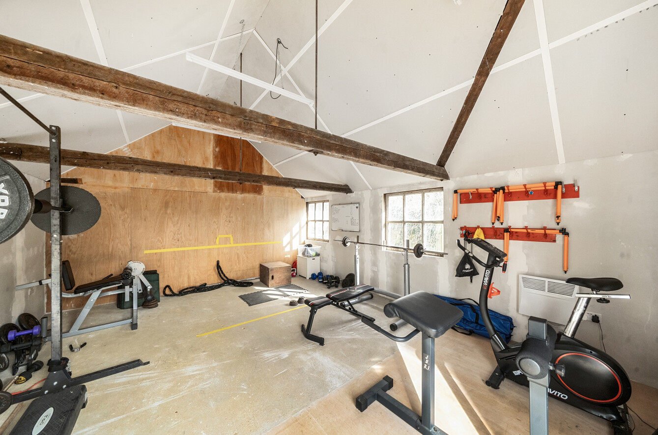 Outside, a gravel drive provides parking for four cars with EV charging point. A detached double garage has been converted to a studio/gym retaining a section of storage to front for lawnmower and bikes. An area of front lawned garden is planted with hydrangeas and climbing wisteria.