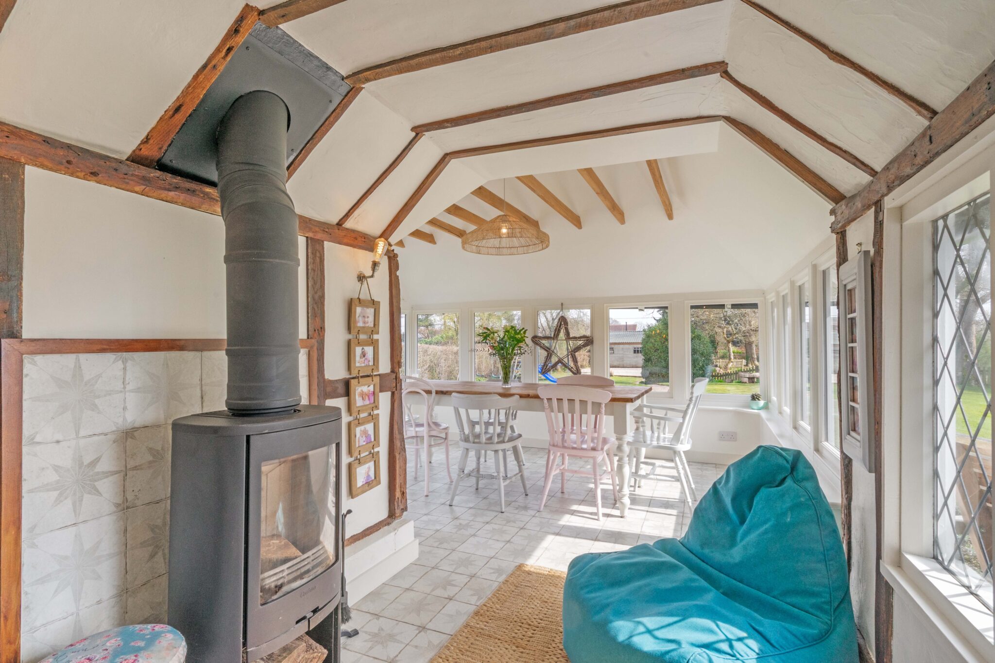 The new kitchen/breakfast room is a wonderful family space which benefits from underfloor heating, shaker style wall and floor cabinets, quartz worktops, a range cooker, Belfast sink, exposed beams and tiled flooring. Adjacent to the kitchen is a cosy double aspect dining room with a vaulted ceiling and French doors leading directly out to the patio and garden beyond – perfect for entertaining. The large family room and additional sitting room make for an ideal family home. Taking the stairs to the first floor, you find five well-proportioned bedrooms and a family shower room.