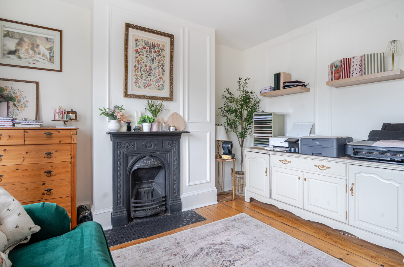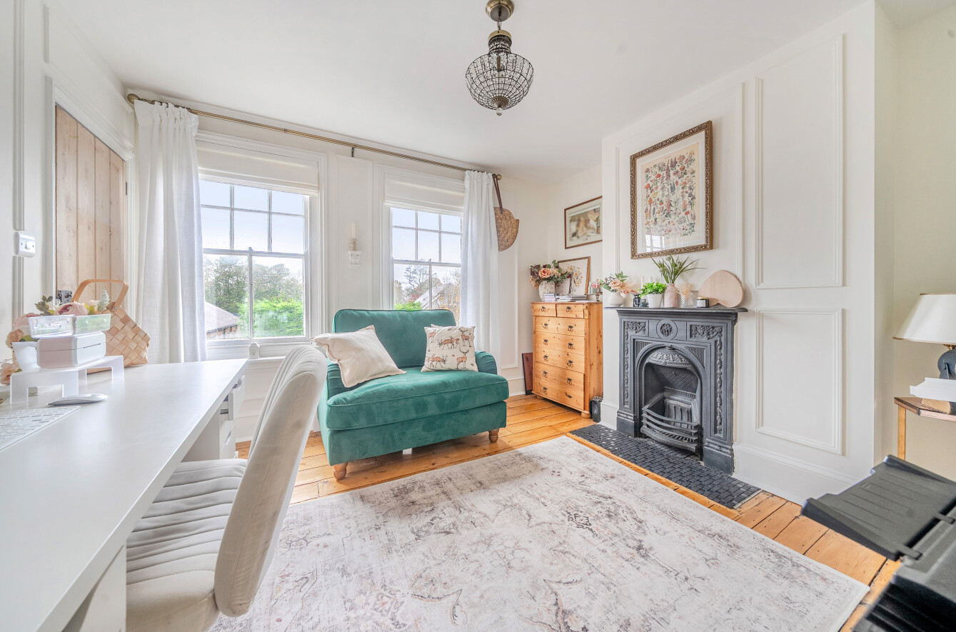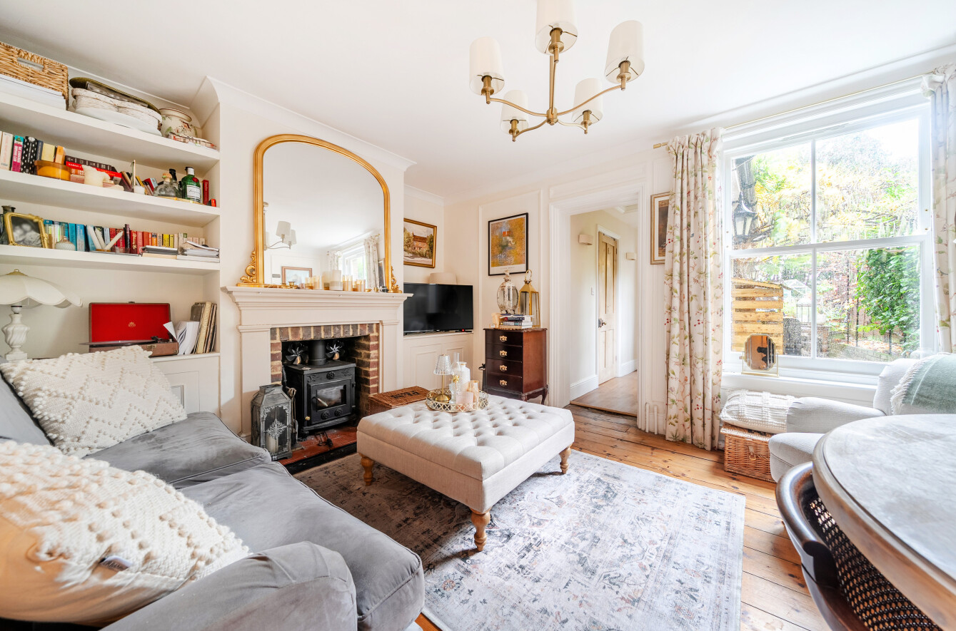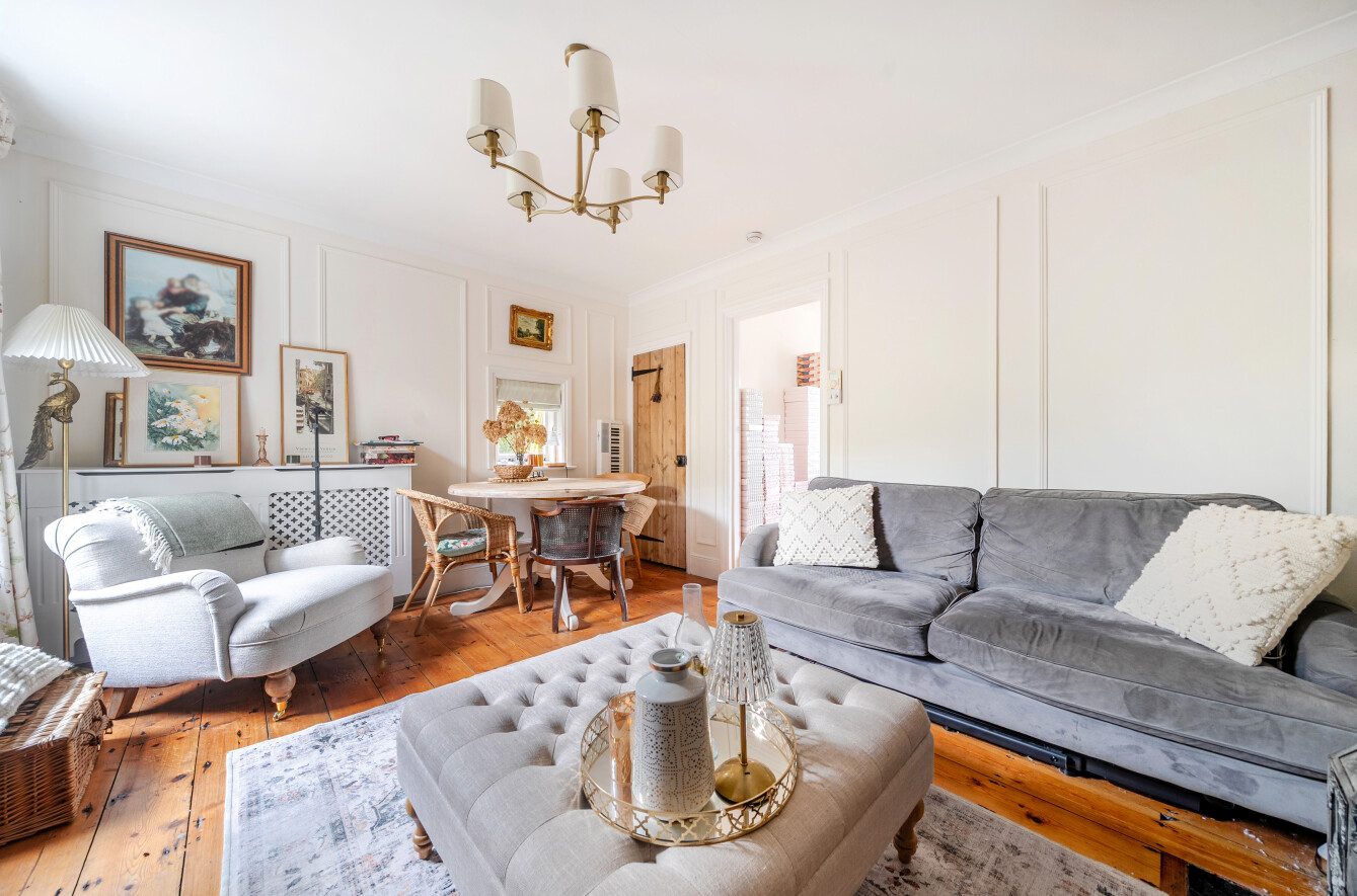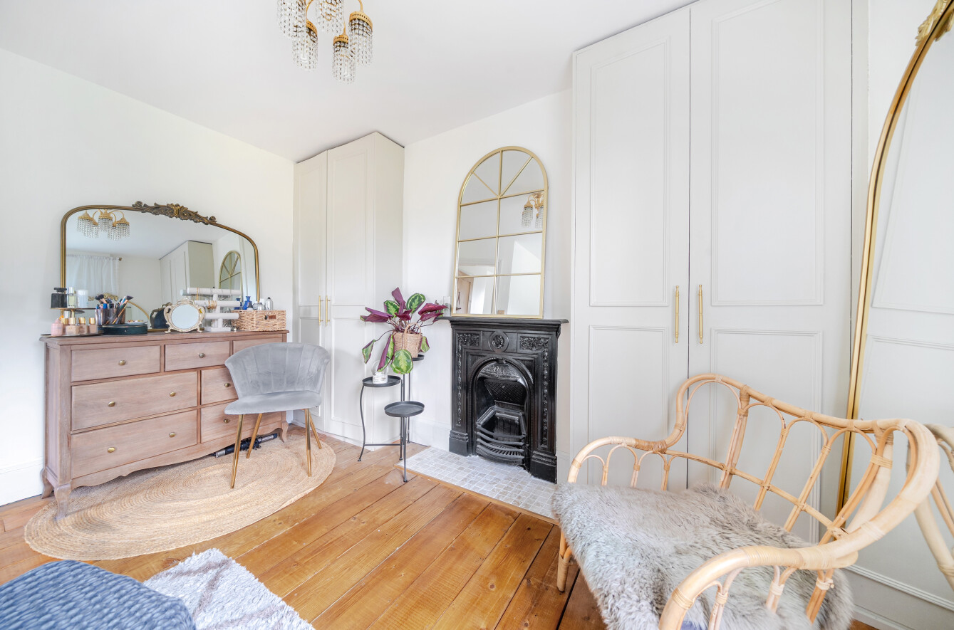 This beautiful unlisted property, which has approximately 860 sq. ft of internal living space over two floors, combines traditional detailing with modern comfort. Entering through the front door you come to a light and spacious sitting room with a large sash window, original wooden floorboards and a feature fireplace which leads into a beautiful living/dining room with a brick lined fireplace housing a wood burning stove and dual aspect windows allowing an abundance of natural light to flood in. The stylish kitchen is fitted with shaker-style cabinetry, solid wood worktops, and French doors opening onto the garden terrace—ideal for summer dining and everyday family life. Also on the ground floor, there is a contemporary bathroom featuring a bath with overhead shower and modern tiling. The downstairs sash windows have all been replaced with new like for like double glazed sash windows.