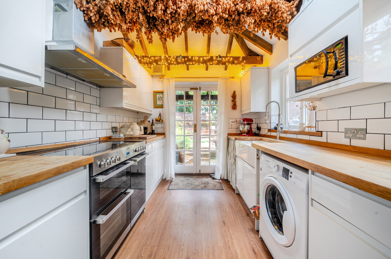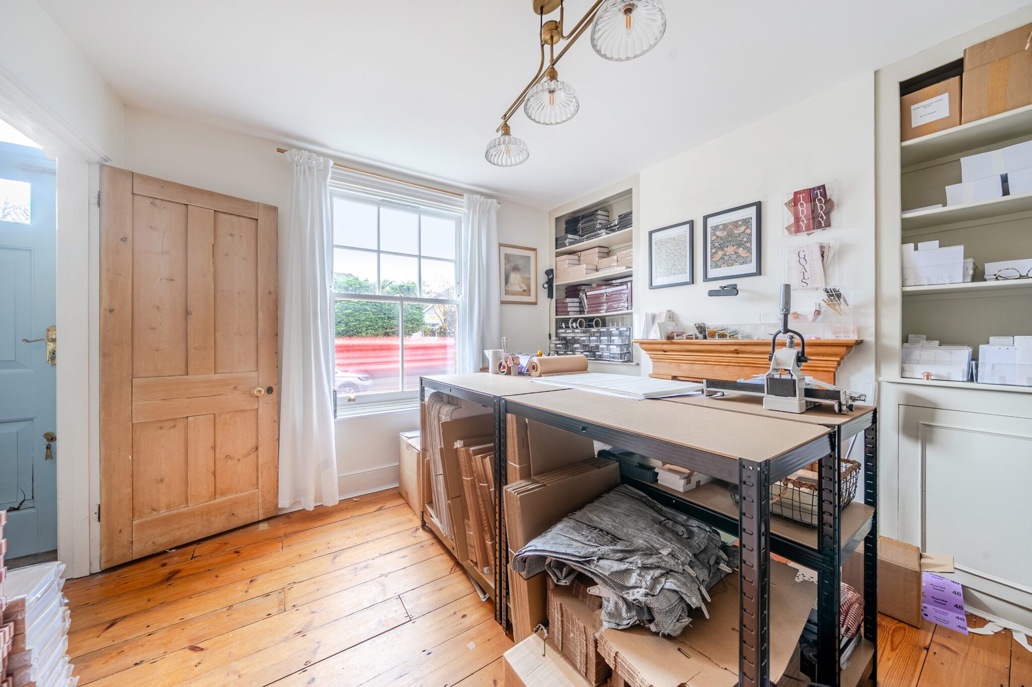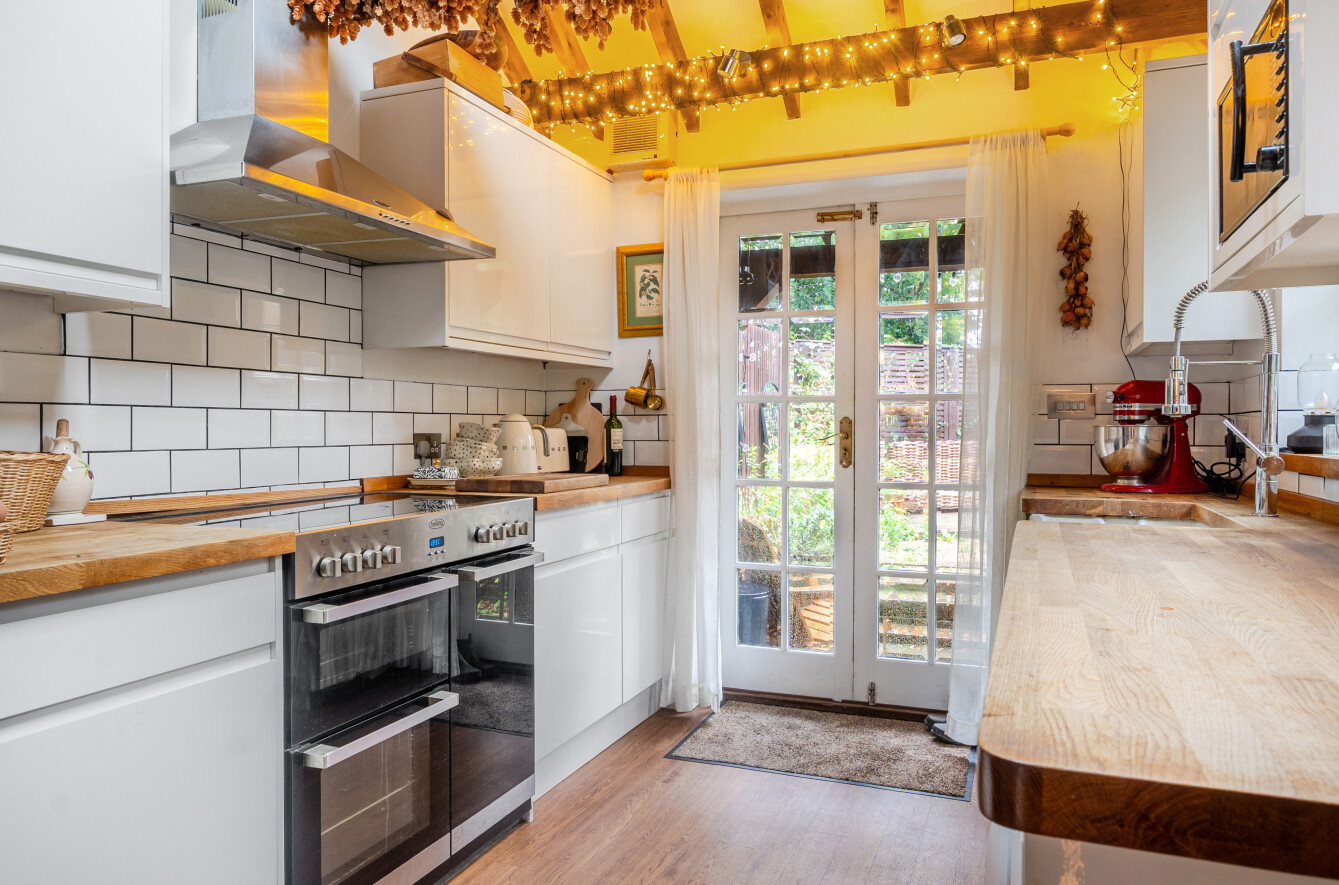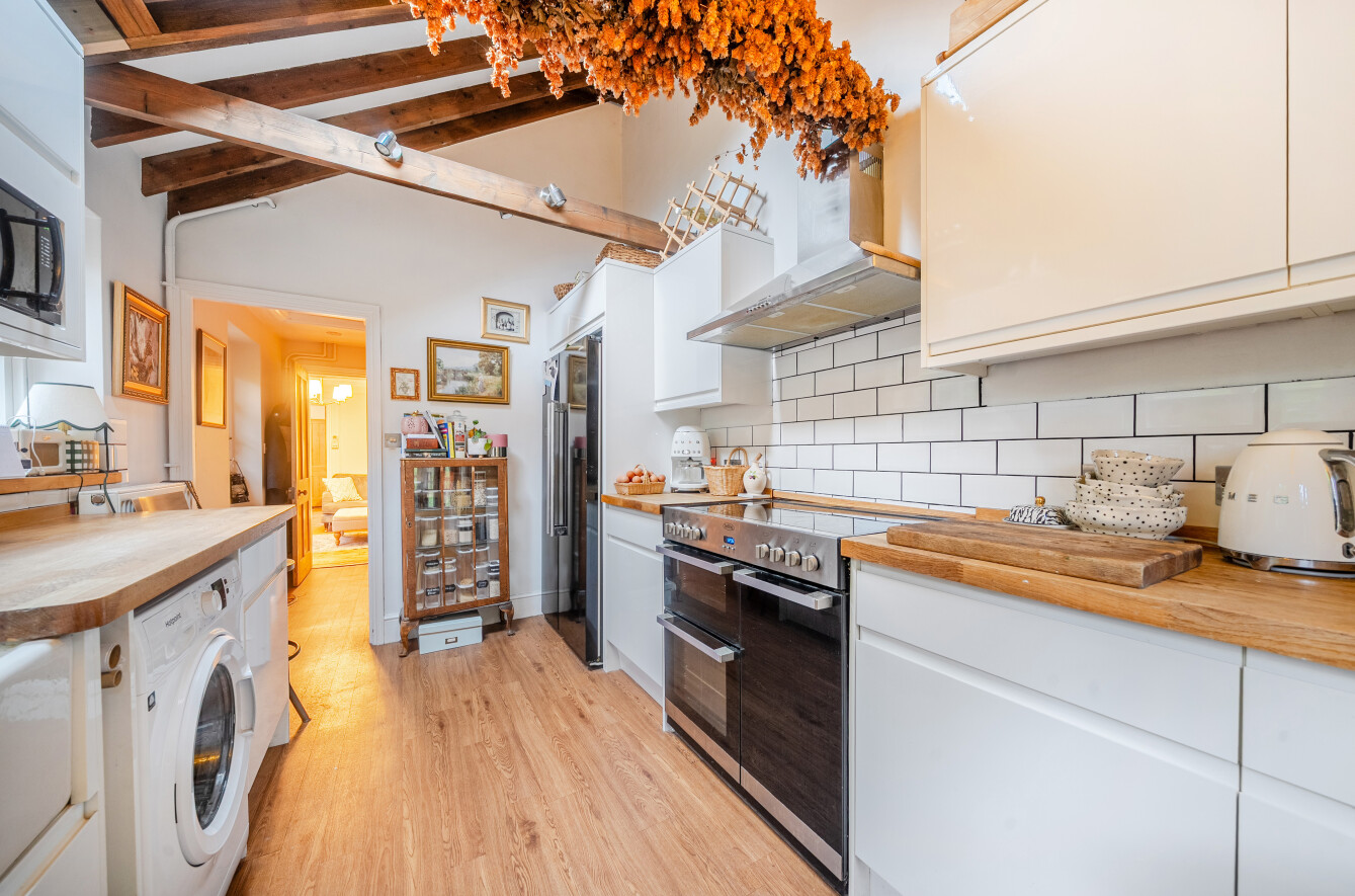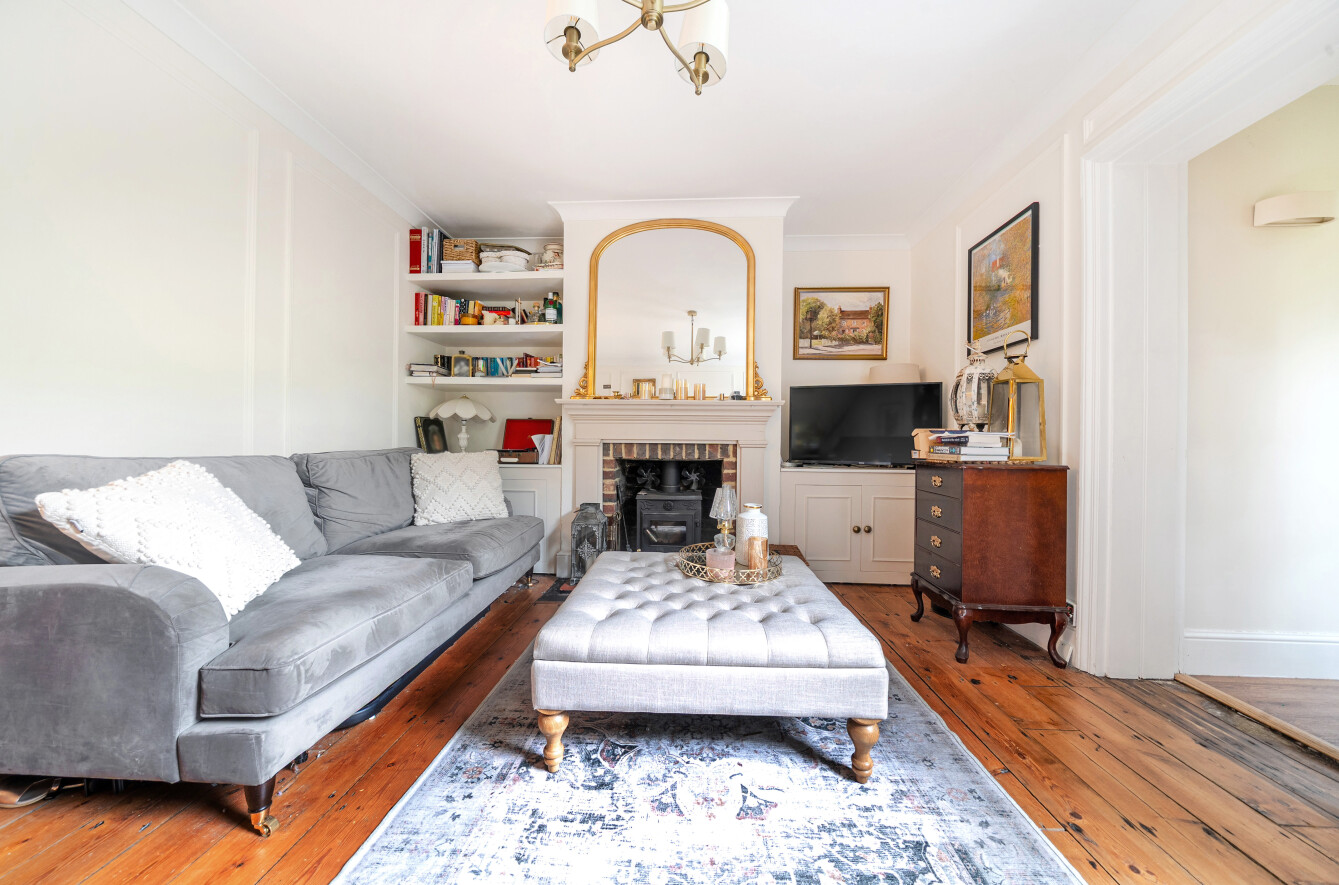 This beautiful unlisted property, which has approximately 860 sq. ft of internal living space over two floors, combines traditional detailing with modern comfort. Entering through the front door you come to a light and spacious sitting room with a large sash window, original wooden floorboards and a feature fireplace which leads into a beautiful living/dining room with a brick lined fireplace housing a wood burning stove and dual aspect windows allowing an abundance of natural light to flood in. The stylish kitchen is fitted with shaker-style cabinetry, solid wood worktops, and French doors opening onto the garden terrace—ideal for summer dining and everyday family life. Also on the ground floor, there is a contemporary bathroom featuring a bath with overhead shower and modern tiling. The downstairs sash windows have all been replaced with new like for like double glazed sash windows.