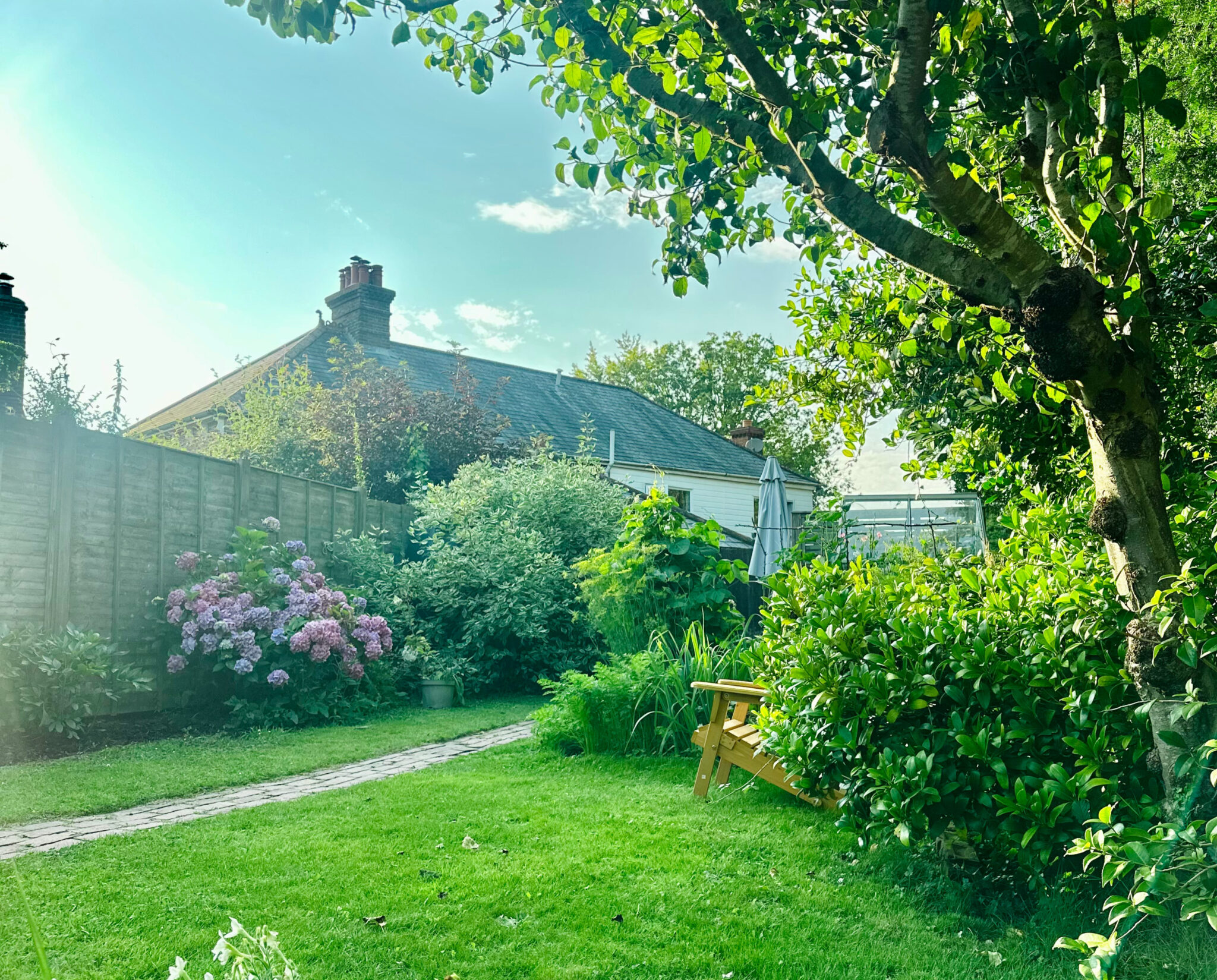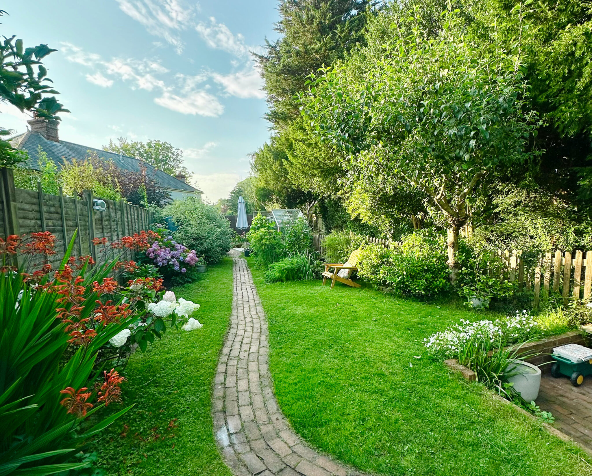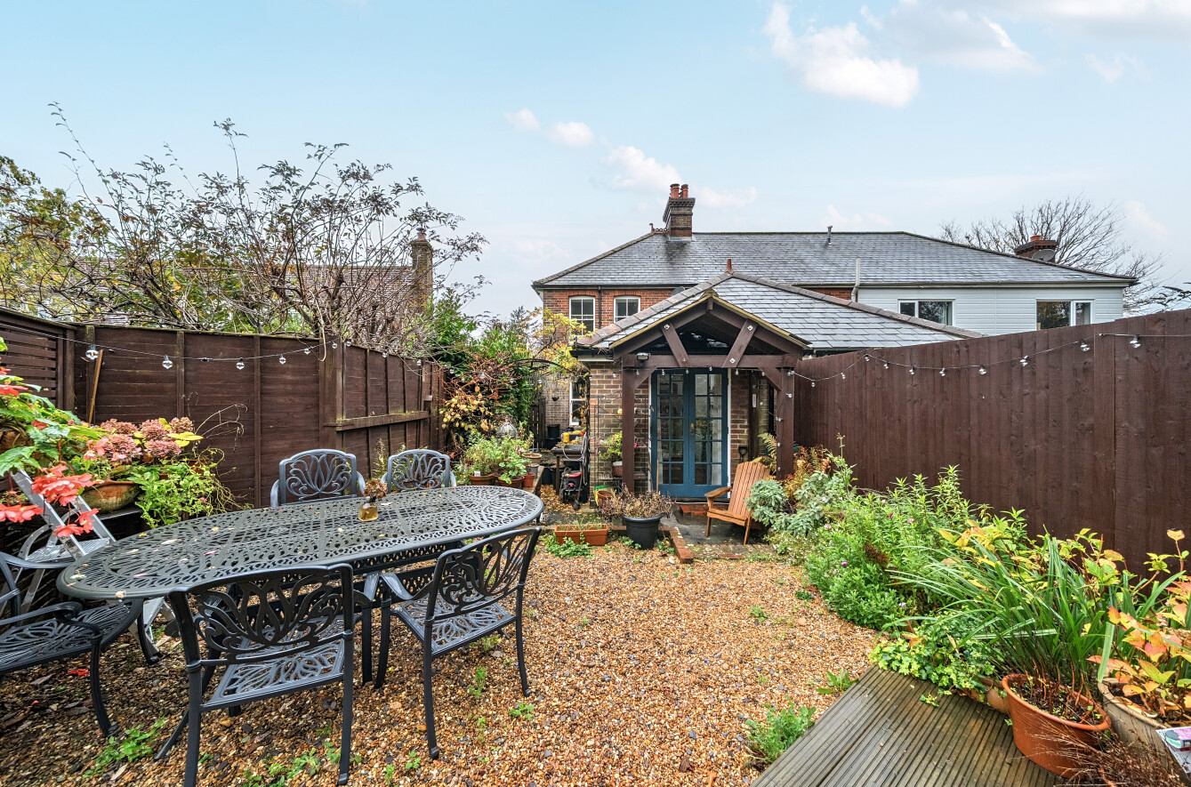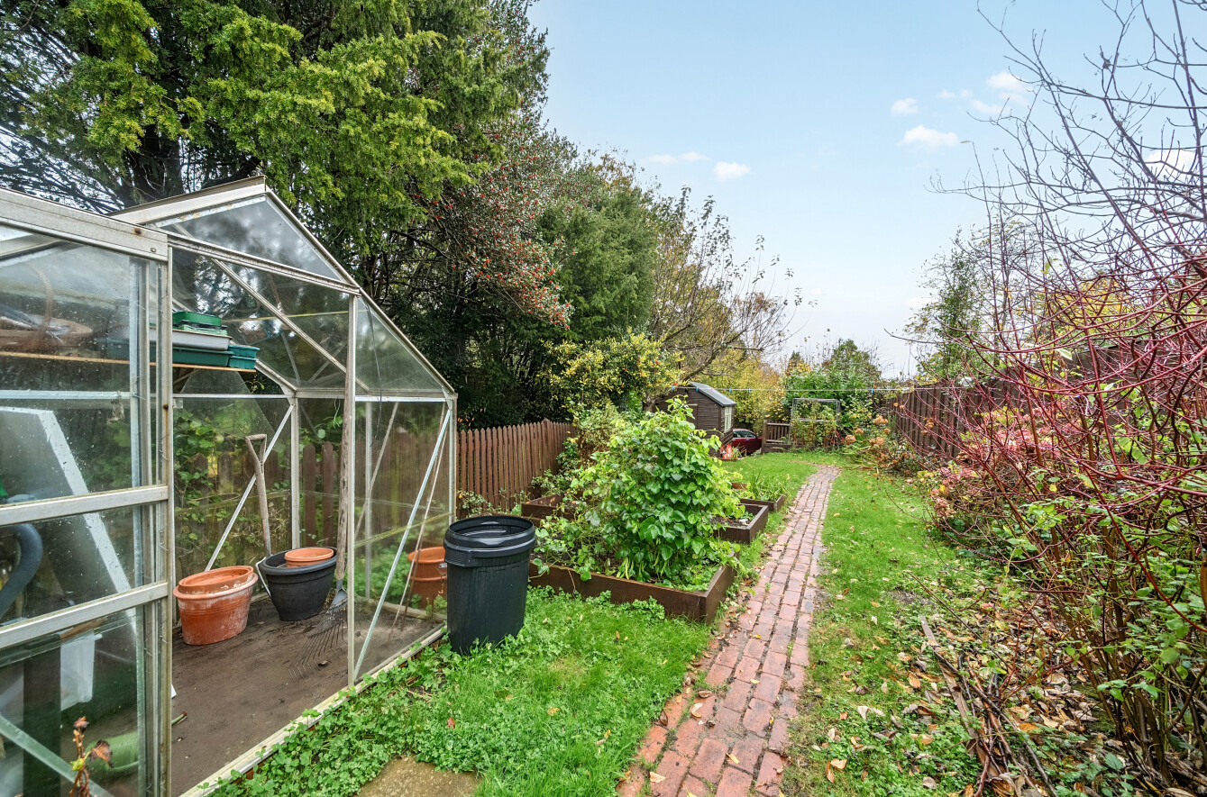 Outside, the property boasts a large rear garden, thoughtfully landscaped with a brick pathway, mature planting, and a greenhouse. A secluded patio area provides the perfect spot for outdoor dining, while to the front is a small garden framed by picket fence. To the rear of the property is a large private parking area with ample room for several cars.