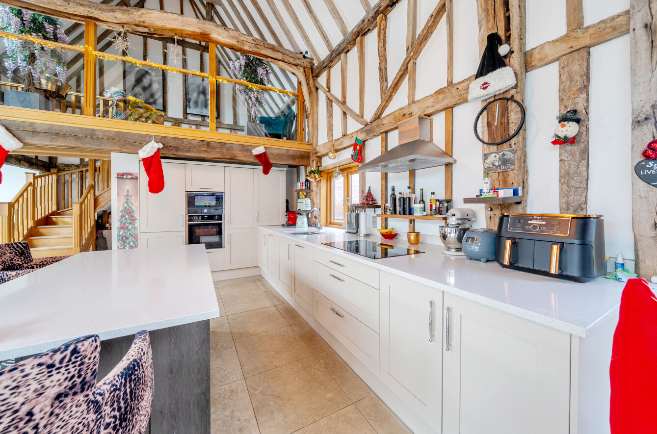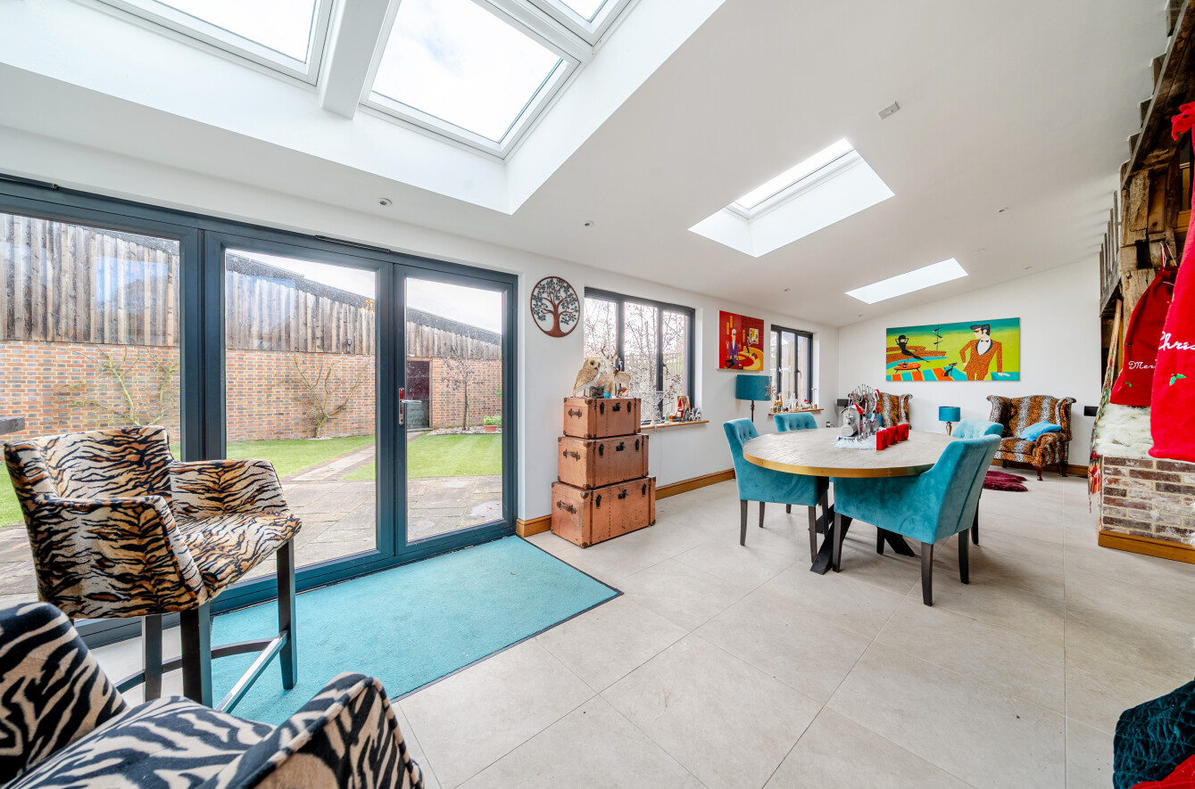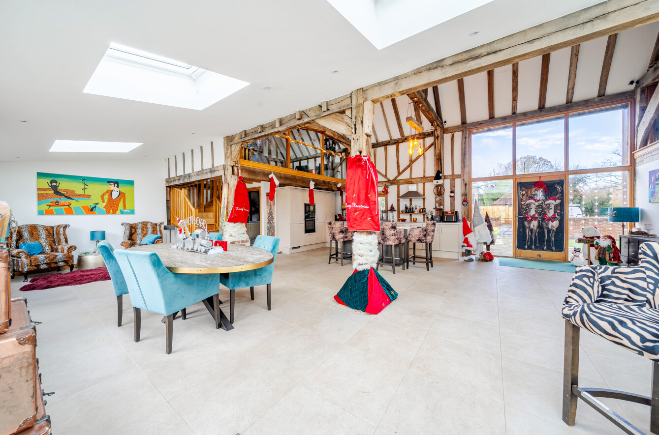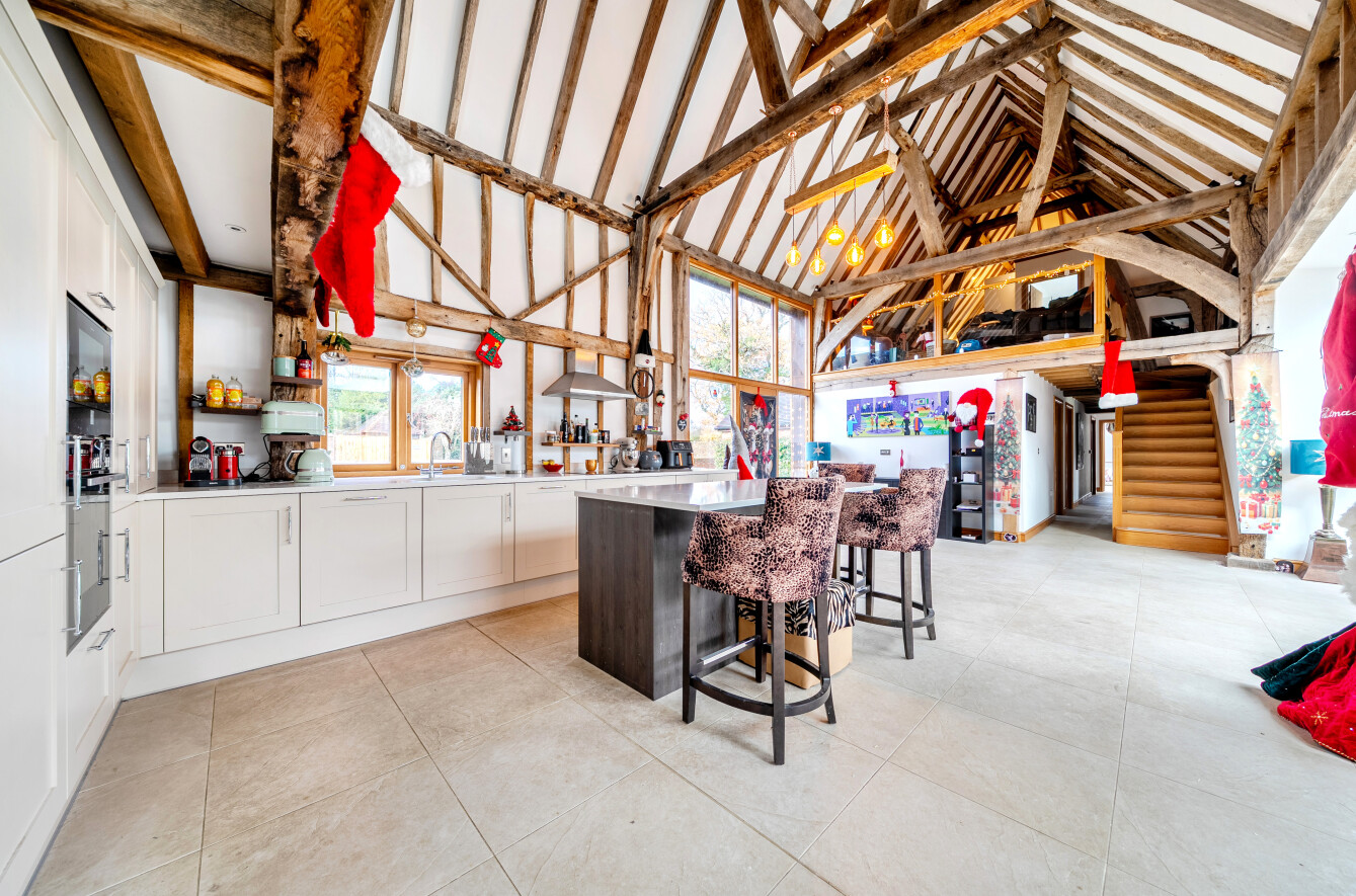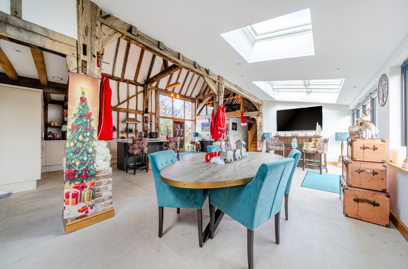 The heart of the home is the superb 34′ x 26′ kitchen/dining hall, set beneath a soaring vaulted ceiling with full-height windows positioned where the original cart doors once stood. Oak timbers, tiled flooring, and remote-controlled Velux rooflights create an uplifting, architectural space ideal for both everyday life and large-scale entertaining. Bi-fold doors open directly to the rear garden.