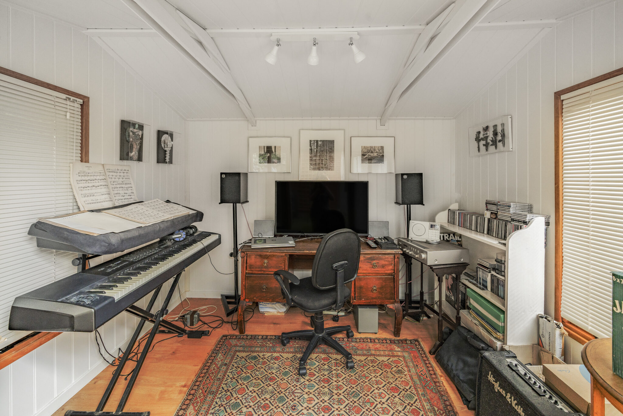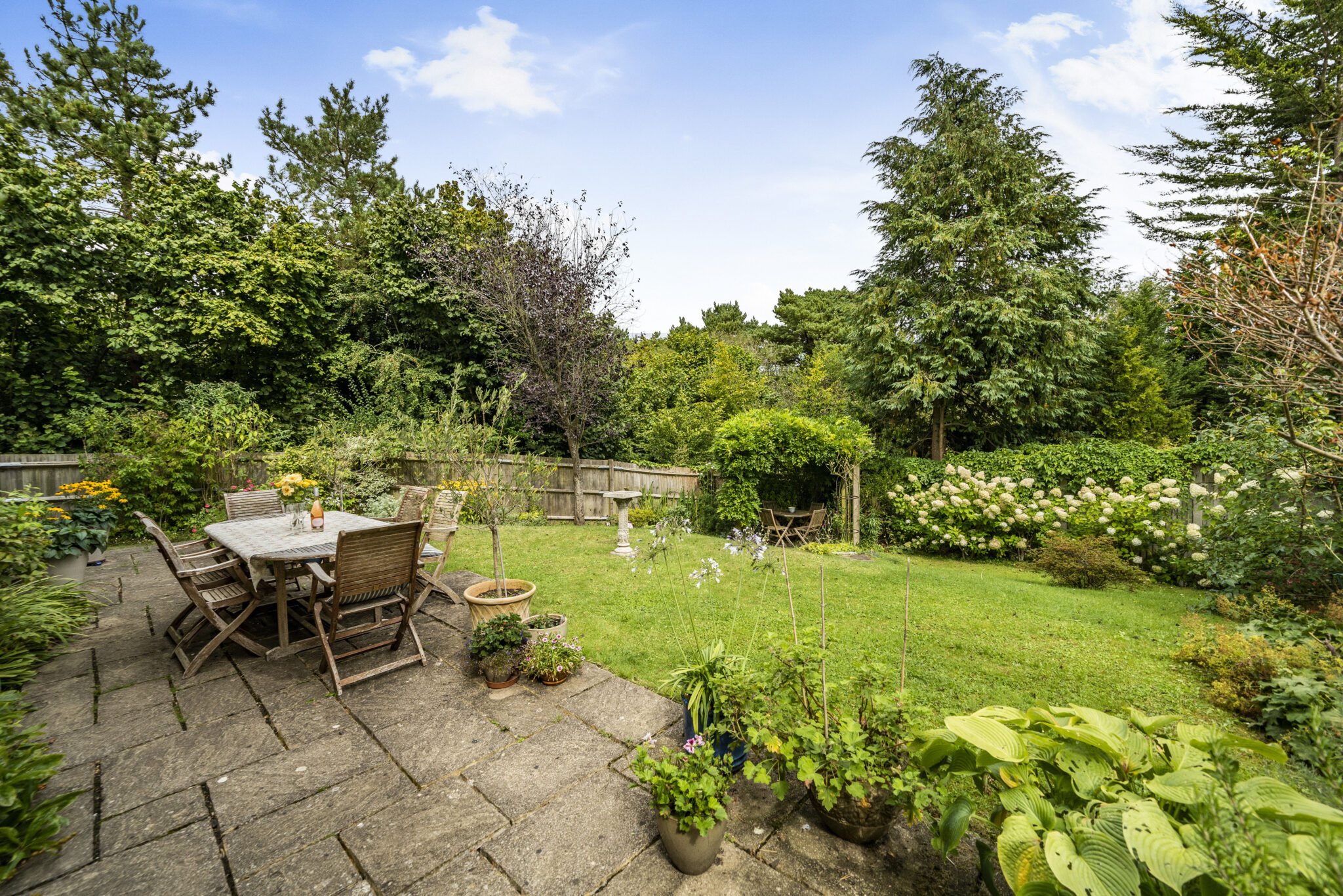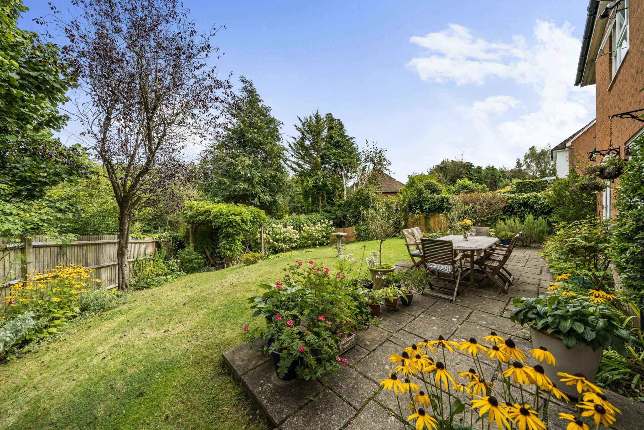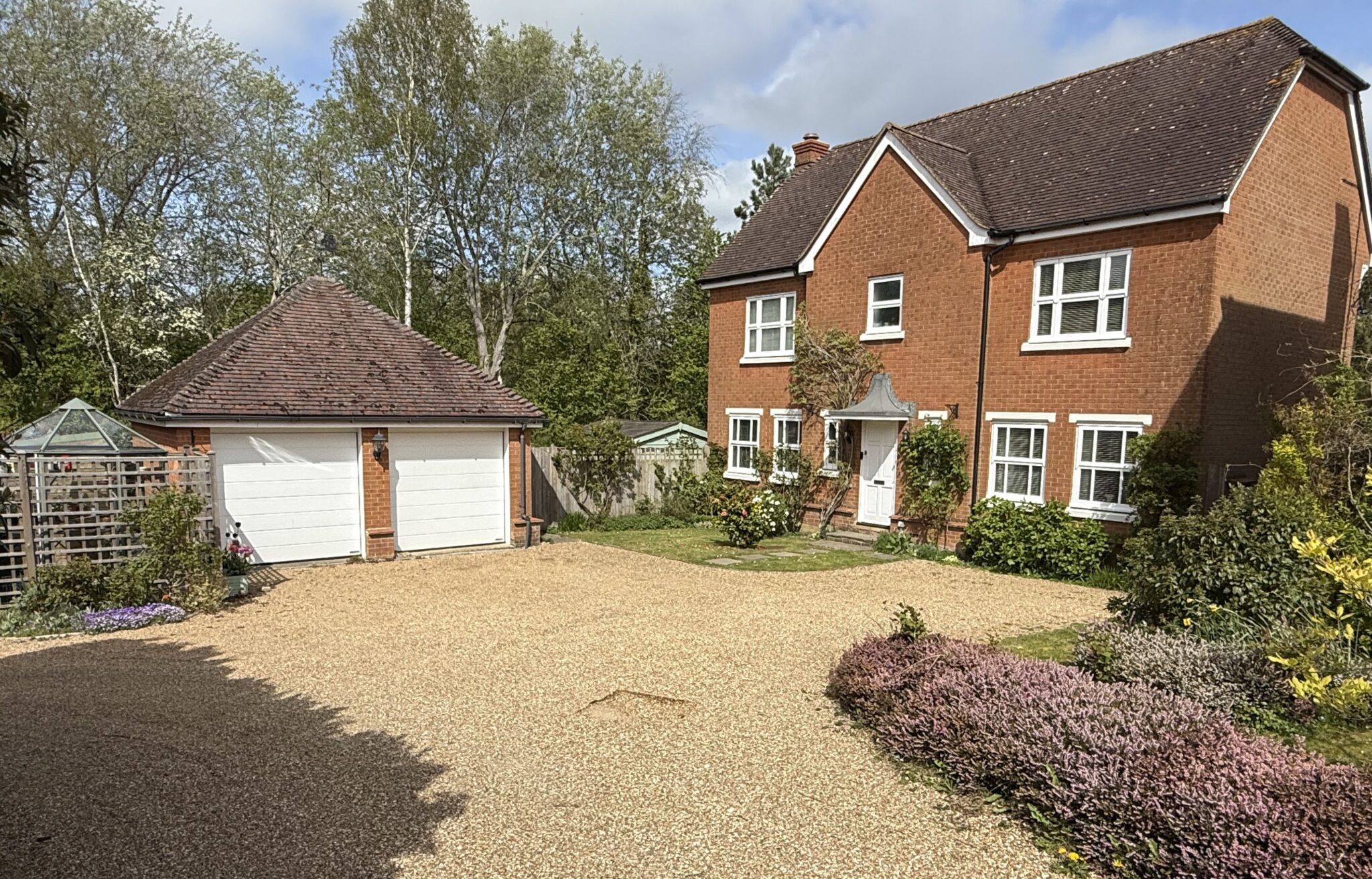 Outside, the property is approached via a gravel driveway providing parking and access to a detached double garage. The rear garden is attractively landscaped and predominantly laid to lawn with a paved terrace adjoining the house, ideal for outdoor dining and entertaining. A gazebo provides a sheltered seating area, with planted beds and borders adding interest. The garden backs onto communal meadowland with direct access to woodland and countryside beyond. Outbuildings include a garden shed, workshop/tool shed, octagonal greenhouse and a detached Malvern garden studio with power connected.