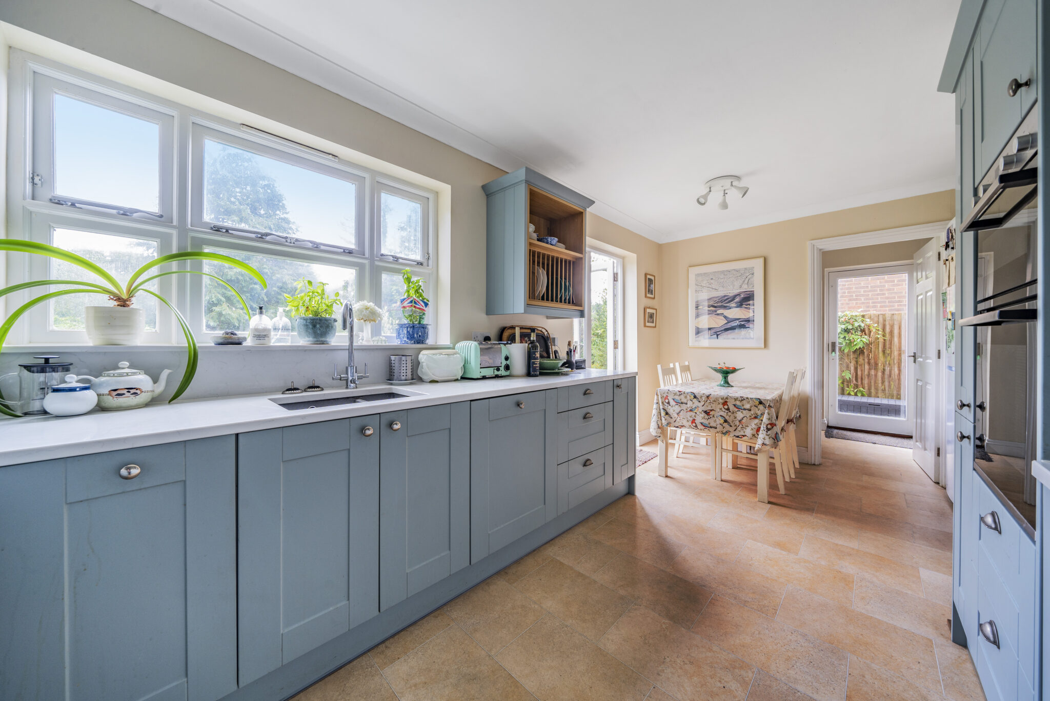 The dining room is positioned opposite the kitchen and provides a versatile second reception room, ideal for formal dining or family use. The kitchen/breakfast room is fitted with a contemporary Wren kitchen incorporating Bosch appliances including double eye-level ovens, dishwasher and five-ring gas hob with extractor hood vented externally. Xena Quartz worktops provide generous preparation space with an inset one-and-a-half bowl sink, along with a range of fitted cupboards and wall cabinets. There is space for a fridge freezer and doors open directly onto the rear terrace and garden. A doorway leads to the utility room, which houses a wall-mounted Worcester Bosch gas boiler, additional storage, stainless steel sink, and space for washing machine and tumble dryer, with a door providing access to the side return.